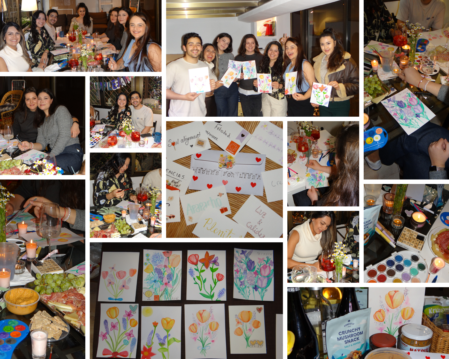 Realizamos una edición para un cumpleaños 100% personalizada en donde incluimos la velita con etiqueta con el nombre de la cumpleañera, clase de acuarelas con material, snacks y vino.